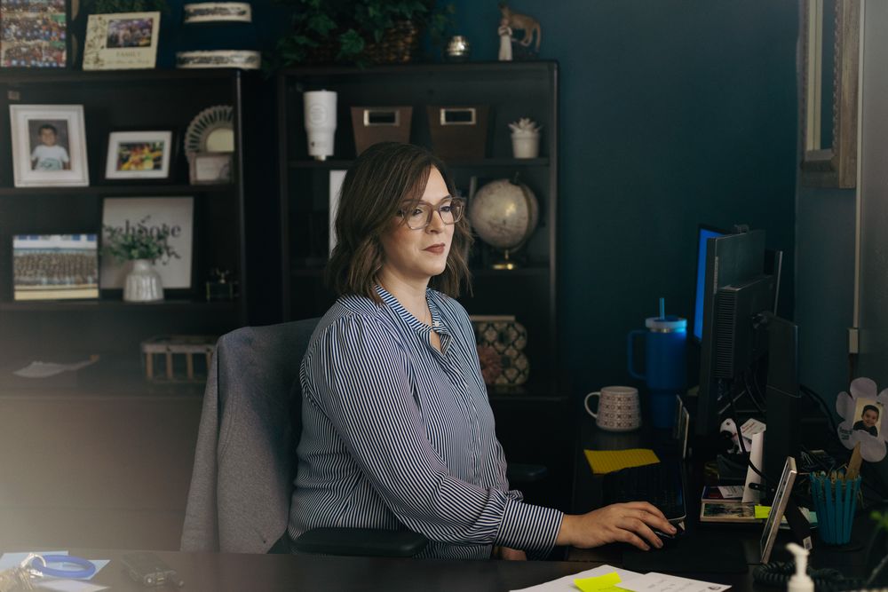 Principal Elizabeth Minto-Bauer works at her desk at Coakley Middle School in Harlingen CISD.