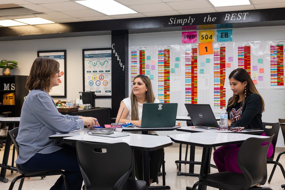 Coakley Middle School Principal Elizabeth Minto-Bauer meets with Cassandra Garcia, a Lever Leader, and math teacher Naian Hernandez.