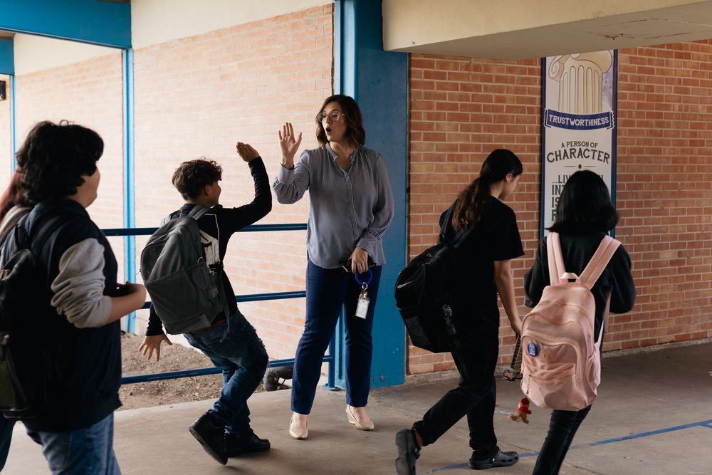 Principal Elizabeth Minto-Bauer high-fives students in the hallway at Coakley Middle School in Harlingen CISD.