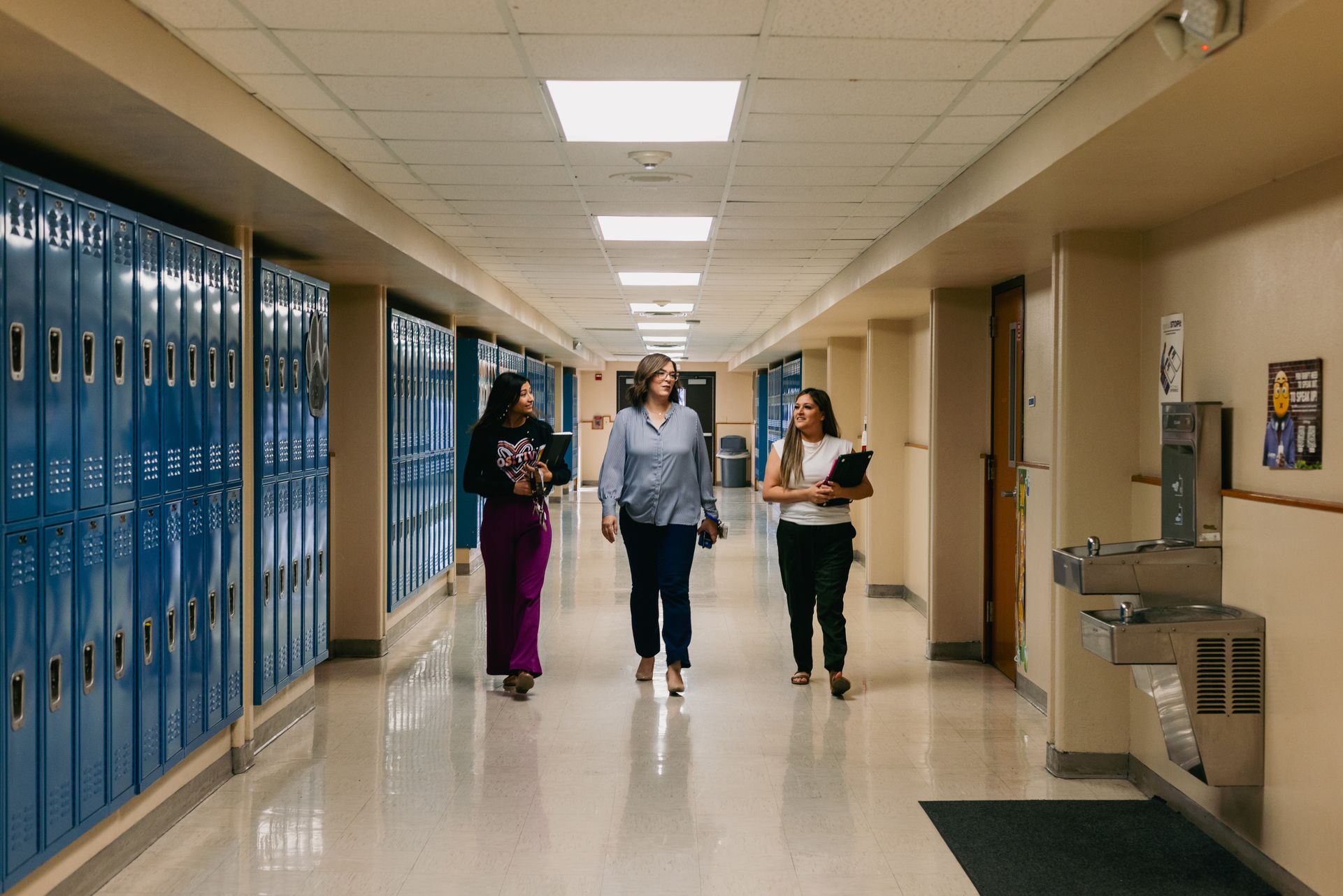 Principal Elizabeth Minto-Bauer walks the hallways with teachers Naian Hernandez and Cassandra Garcia at Coakley Middle School in Harlingen CISD.
